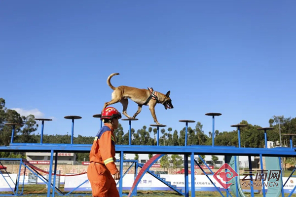 在攀登障碍科目竞赛中,搜救犬听从训导员口令顺利通过独木桥、跷跷板、鱼鳞板、三级跳台等障碍,动作迅速敏捷,展现出了超强的技能本领。