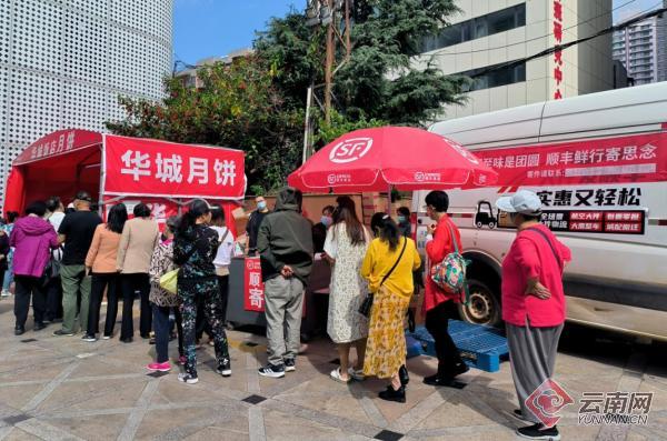 临近中秋,位于昆明环城南路的华城饭店附近,前来购买月饼的市民早早排起了长队,月饼销售摊位旁,顺丰快递小哥熟练地打包装箱,为市民提供即时寄件服务。