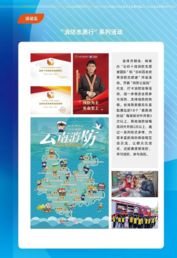 宣传月期间,将举办“云岭十佳消防志愿者团队”和“云岭百名优秀消防志愿者”评选活动,开展“消防公益说”代言、打卡消防站等活动,进一步激发全民参与消防、支持消防的热情。总队首批推出的18个“最美消防站”每周将对外开放3次以上,其他消防站每周对外开放2次以上,通过一系列形式多样、内容丰富的消防体验和互动交流,让群众沉浸式学习消防知识,近距离感受消防、学习消防、参与消防。