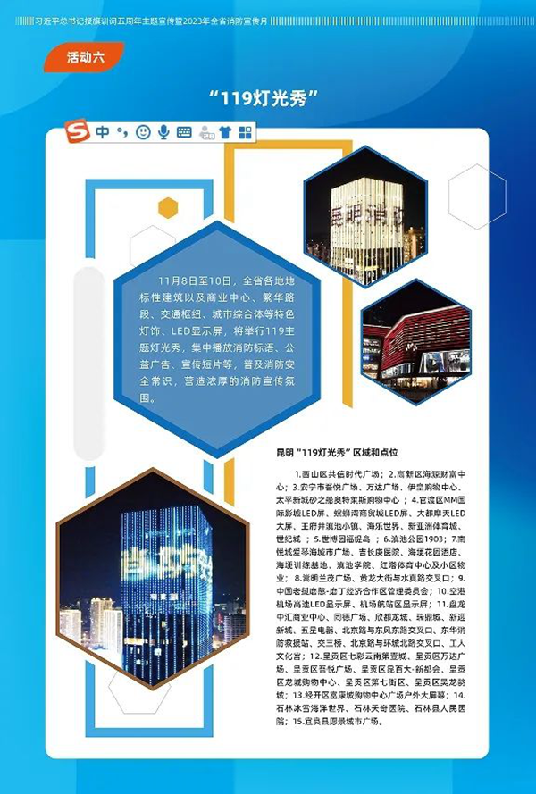 11月8日至10日,全省各地地标性建筑以及商业中心、繁华路段、交通枢纽、城市综合体等特色灯饰、LED显示屏,将举行119主题灯光秀,集中播放消防标语、公益广告、宣传短片等,普及消防安全常识,营造浓厚的消防宣传氛围。