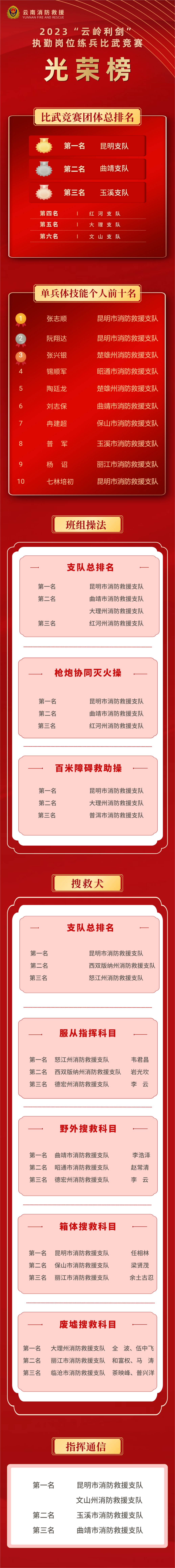 在历时10天的比武竞赛中,云南省消防救援总队坚持按照实战化要求,把指挥通信、实战实操、搜救犬3个岗位22项科目纳入比武,全省16个支队精心选派的544名消防尖兵同步开赛、同台竞技,既比拼体能、技能,也在比拼决定战场胜败的各个环节、各个要素,不仅是对一年来练兵成效的一次大考核,更是对全省消防救援队伍实战能力的一场大检阅。最终,昆明、曲靖、玉溪、红河、大理支队位列团体总积分前五名,文山支队荣获精神文明奖。