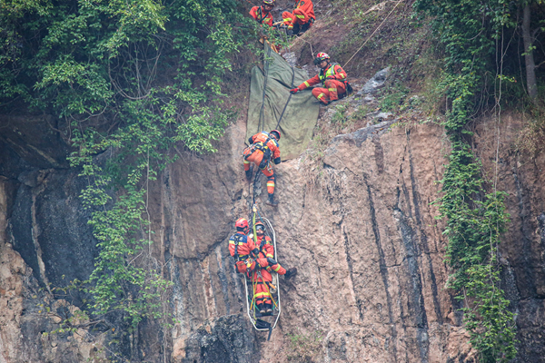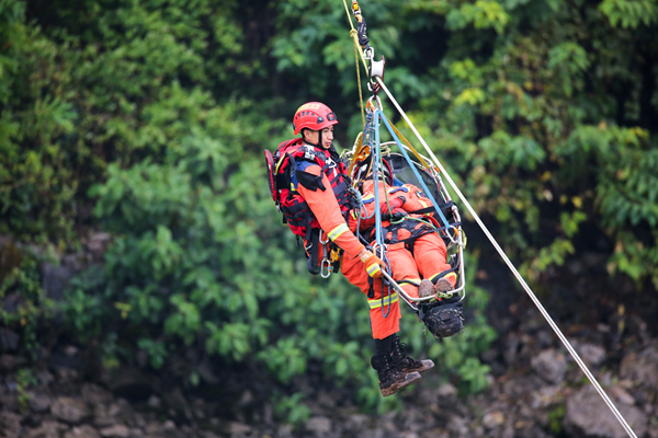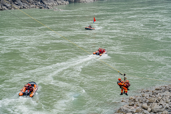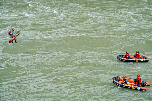 开幕式结束后,同步开展了器材装备展示和垂直崖壁救援、背负式悬崖救援、怒江横渡斜下转运、怒江T型孤岛救援4个科目展示。