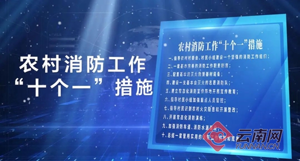 “十个一”包括指导各县(区)村委会及村民小组建设一个消防工作组织、建立一套完善的消防工作职责制度、配置一批基本的灭火救援器材装备、建设一支会灭火的志愿消防队、建立一个常态化消防宣传阵地、指导村民小组加强重点人员管控、指导村民识别整改农村火灾隐患、开展常态化消防演练、加强消防车道消防水源建设、总结一套农村消防工作机制。