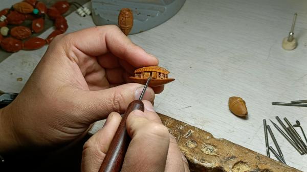 走进玉溪市红塔区李棋街道康井社区2组居民张健家中的“核雕工作室”,一枚枚人物核雕表情栩栩如生。正在雕刻中的乌篷船更是精致巧妙,不仅雕工细致,船只的门还能推开……让人不禁联想到初中课文《核舟记》。今年36岁的张健,一直从事和园林古典建筑相关的工作,2016年,张健接触到了一位喜欢核雕艺术的师傅后,便对这门技艺十分着迷。