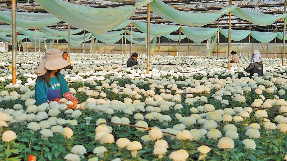 在开远市国家现代农业产业园的温室大棚内,工人在花丛中熟练地采摘鲜花。花卉包装车间里,工人们铆足干劲,整理、包装盆花和鲜切花。“大年初二开始复工复产,80%的员工已正式到岗,节前70万枝的订单已经发完,现在根据节后客户订单量陆续生产,基本每个月能达到50万枝左右。”花卉基地负责人马琳说。