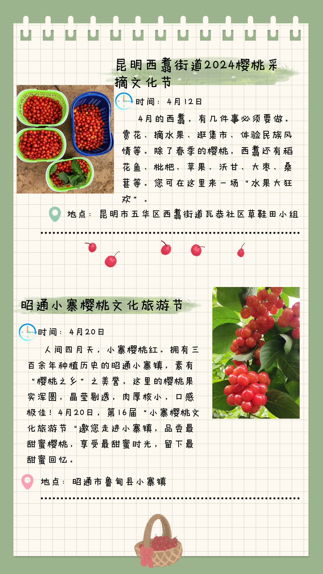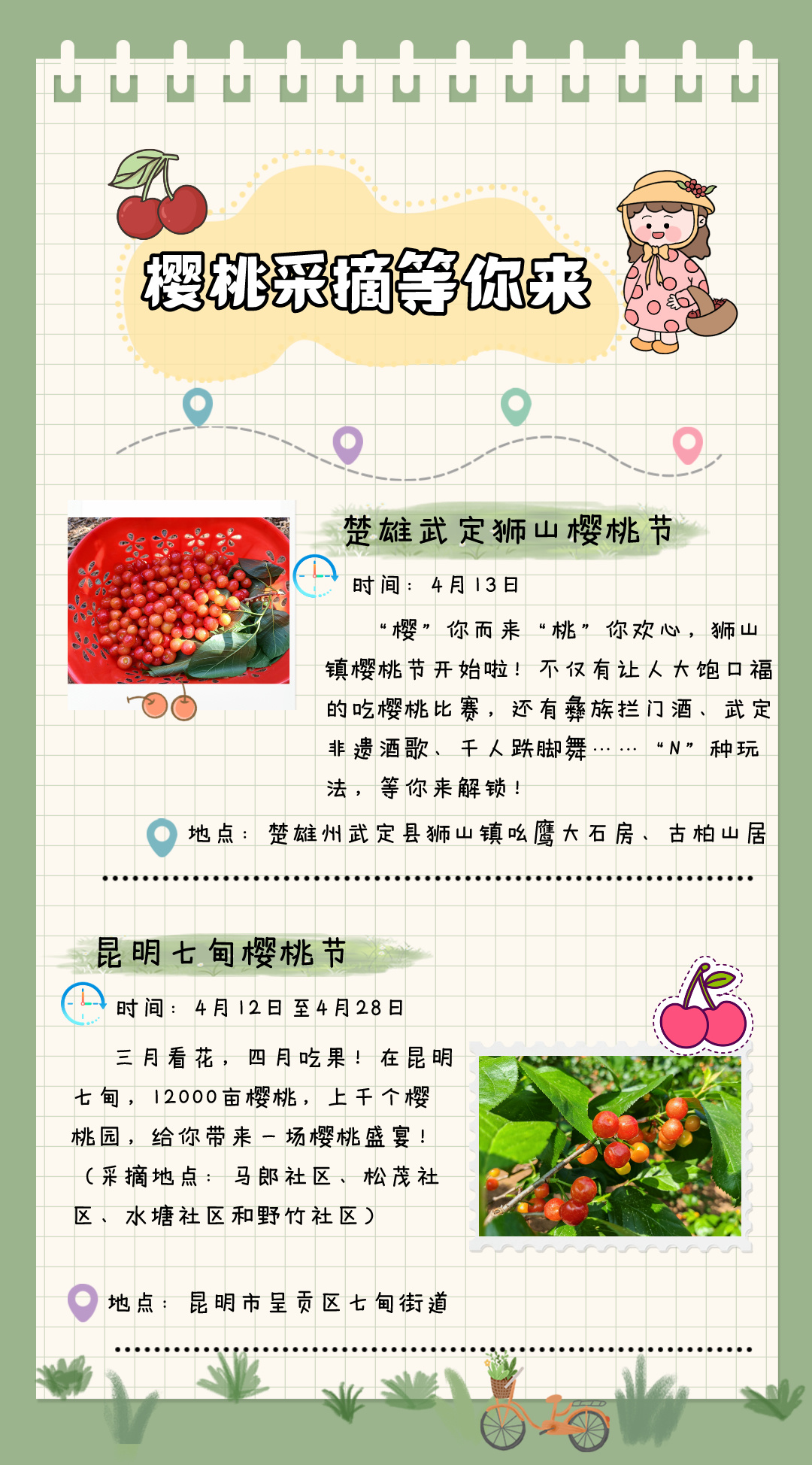 三月看花,四月吃果。在云南,红宝石般的樱桃果陆续成熟进入采摘期,春天也慢慢走向甜蜜。各地的樱桃采摘区除了为樱桃爱好者们实现“樱桃自由”,也准备了多种精彩活动和新奇玩法。这个春天,快携亲朋好友赏花吃果,揣一口袋甜蜜满载而归!