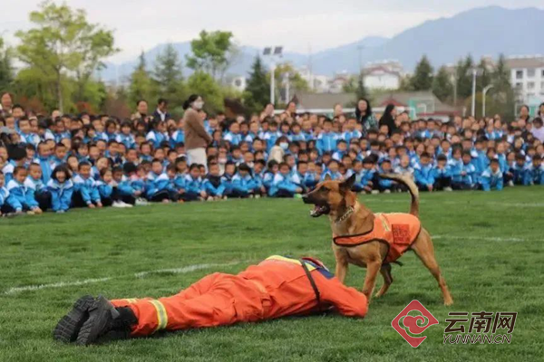 ▲在丽江市古城区祥和学校,一场“防震紧急避险疏散及消防灭火演练”热闹上演。活动期间,师生还了解认识了消防救援服、灭火救援装备器材以及搜救犬的种类、日常训练等。