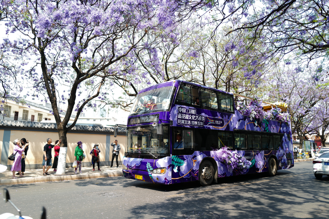 游客乘坐观光巴士观赏蓝花楹 杨峥 陈飞 门世辉 摄