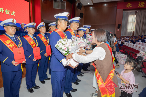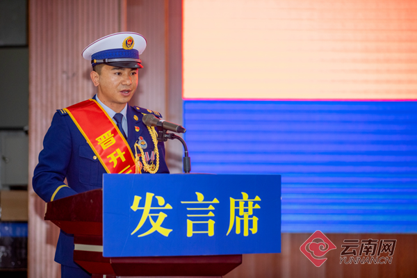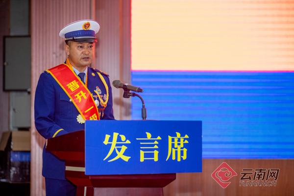 文山州健民路消防救援站一级消防长和利周、昆明市凉亭消防救援站三级消防长江才代表衔级晋升的消防员,感恩组织的关心培养,感谢家人的理解支持,表示将把衔级晋升转化为新的动力,发挥队伍骨干、拳头作用,为队伍建设发展贡献力量。