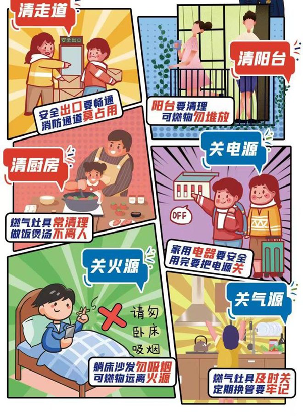 各居民家庭要养成“三清三关”好习惯,即及时清理阳台、厨房可燃物和楼道杂物,离家和入睡时要关火、关气、关电。严禁将电动自行车及其电池带回家停放或充电,严禁电动自行车在楼道、门厅停放和充电。教育小孩不要玩火,因农忙外出时不要将小孩独自留在家里玩耍。高层住宅要保持疏散楼梯的防火门处于常闭状态,勿在电缆井堆放可燃物。