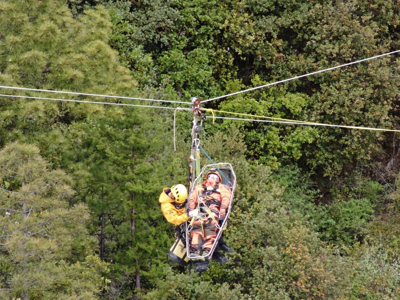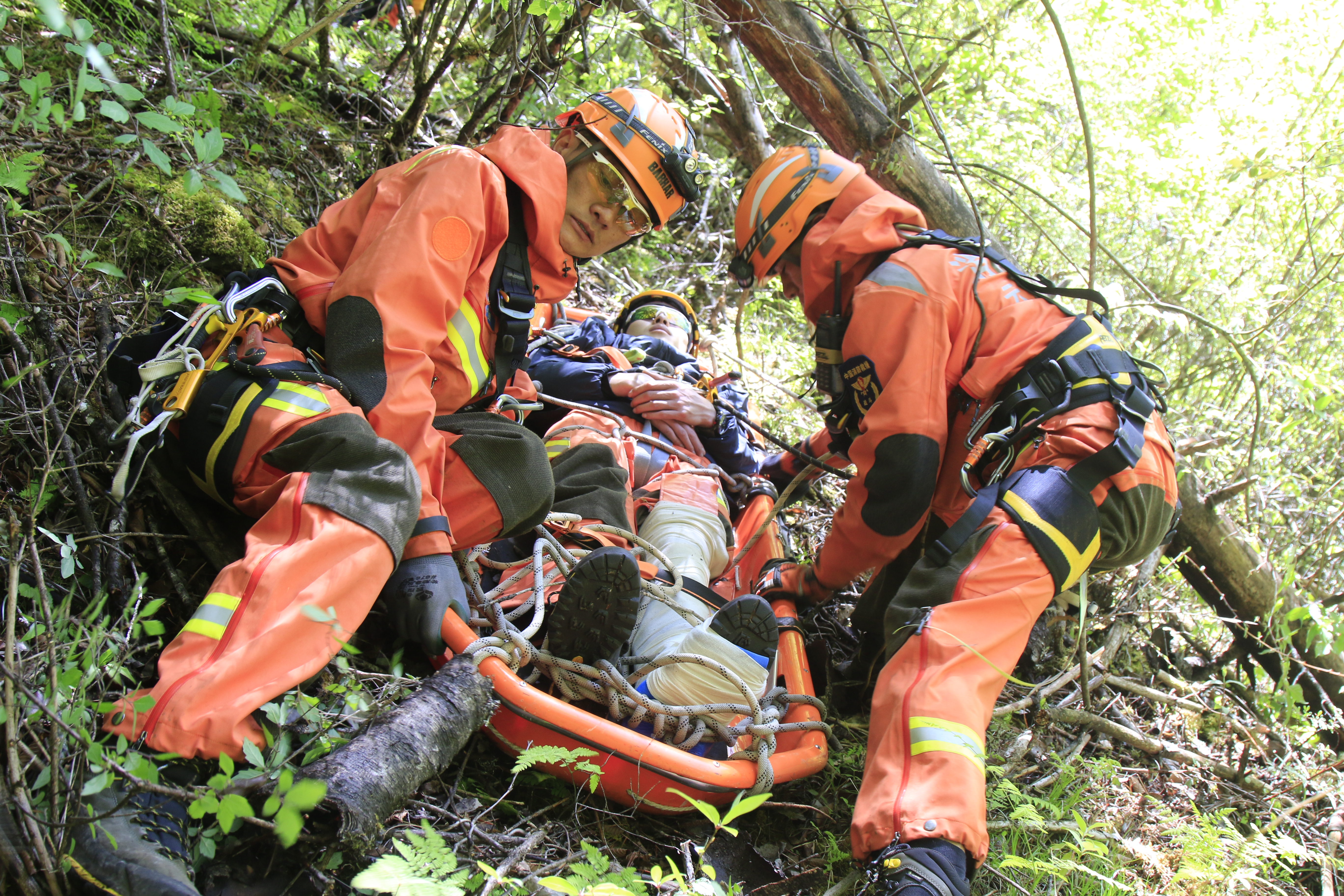 在诸多不利因素下,为安全运转,救护员将伤员固定在担架上,利用边坡救援技术从沟壑中合力将被困人员转运至安全位置。