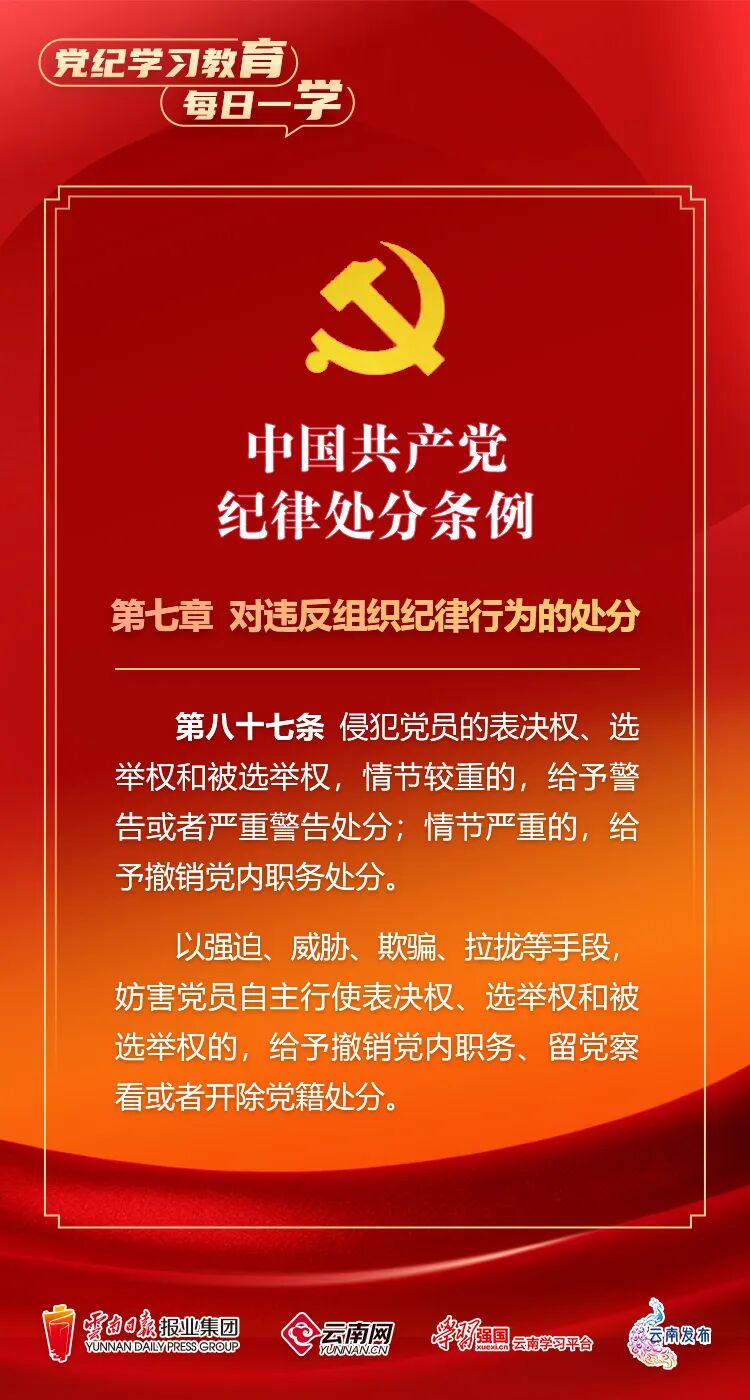 为深入学习贯彻落实习近平总书记关于党纪学习教育的重要讲话和重要指示精神,便于全省各级党组织和广大党员、干部深入学习贯彻修订后的《中国共产党纪律处分条例》,云南网联合“学习强国”云南学习平台、云南发布共同策划推出“党纪学习教育•每日一学”专栏,营造全员参与、人人学纪的浓厚氛围。今天,我们推出第㊶期,一起来学习。