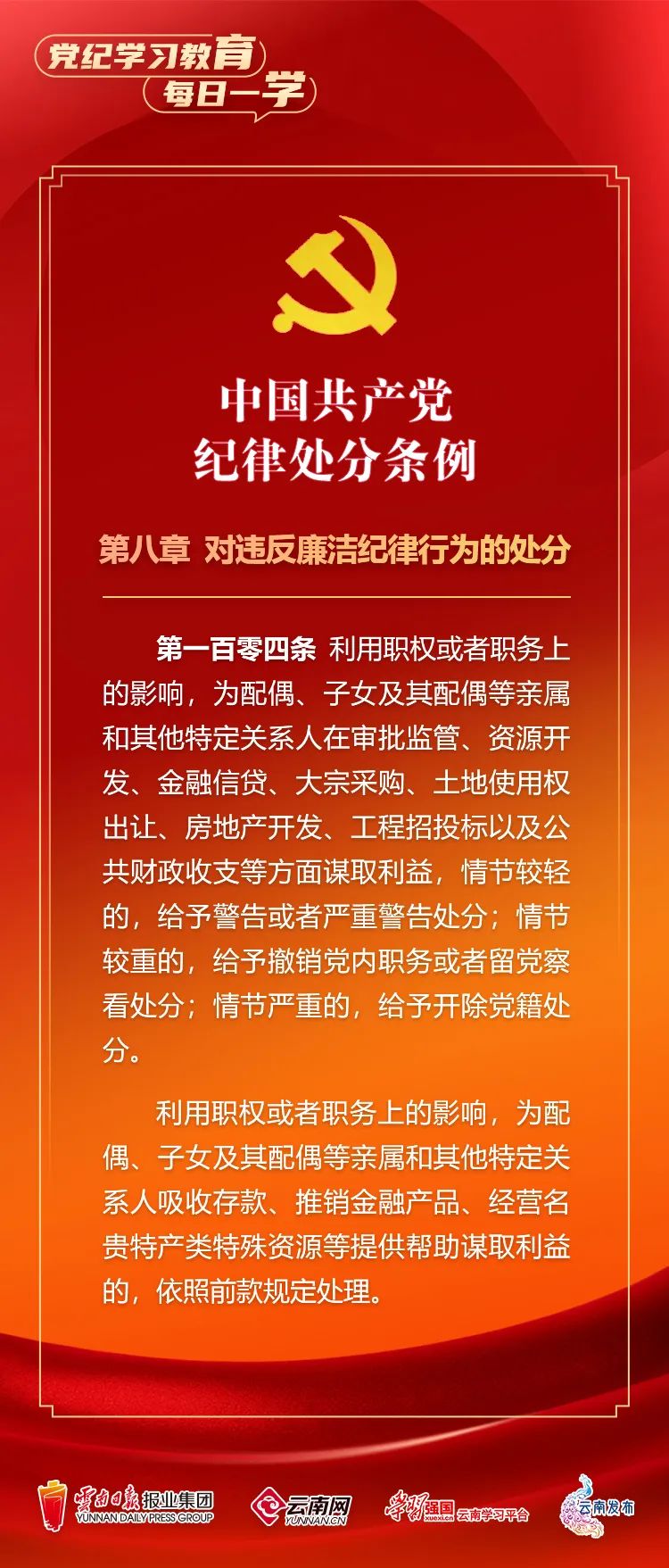 为深入学习贯彻落实习近平总书记关于党纪学习教育的重要讲话和重要指示精神,便于全省各级党组织和广大党员、干部深入学习贯彻修订后的《中国共产党纪律处分条例》,云南网联合“学习强国”云南学习平台、云南发布共同策划推出“党纪学习教育•每日一学”专栏,营造全员参与、人人学纪的浓厚氛围。今天,我们推出第㊾期,一起来学习。