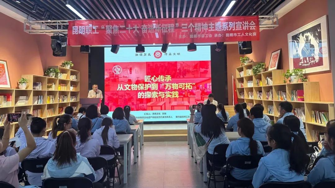 围绕党的二十大,昆明市工人文化宫通过创新学习形式,分享先进事迹,讲好新征程故事,发挥劳动模范、云岭工匠等职工中优秀代表的榜样示范作用,营造劳动光荣的社会风尚和精益求精的敬业风气,将党的二十大精神全面贯彻落实在职工之间。