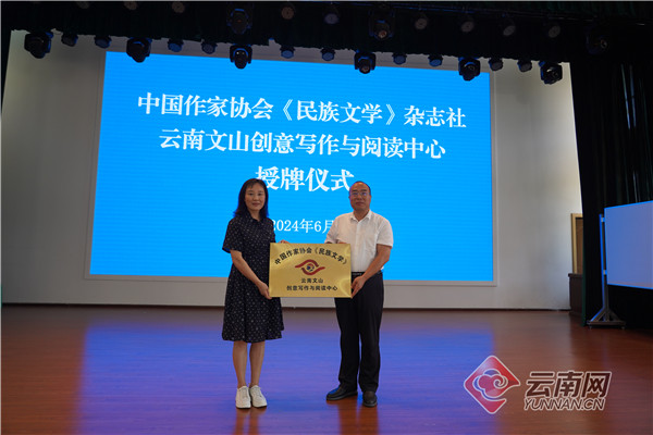 云南网讯(记者 黄立康)6月19日,中国作家协会《民族文学》杂志社云南文山创意写作与阅读中心授牌仪式在文山壮族苗族自治州退役军人事务局礼堂举行。