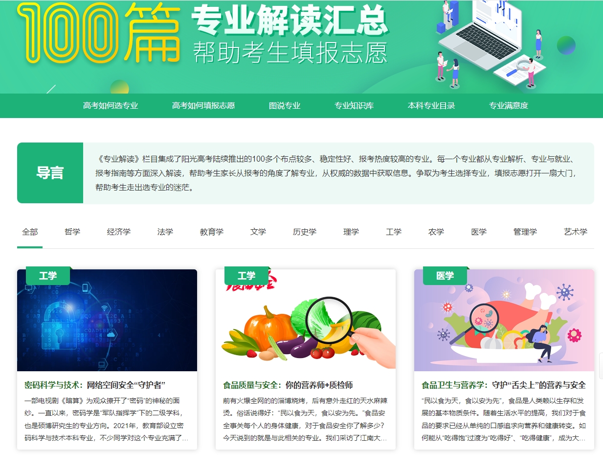 小编注意到,教育部“阳光高考”信息平台下的专业解读栏目集中了哲学、经济学、法学等众多大类学科下的子学科解读,解读文章涉及专业解析、专业就业、报考指南和专业推荐5个板块,还提供了相应的全国普通高校毕业生规模。可谓相当贴心了。