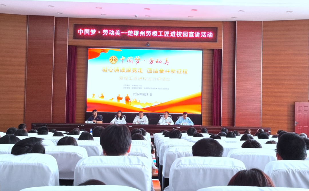 5月31日,楚雄州总工会与楚雄技师学院、云南现代职业技术学院工会联合会联合在楚雄技师学院举办主题为“中国梦·劳动美——凝心铸魂跟党走 团结奋斗新征程”劳模工匠进校园宣讲活动。开展“劳模工匠进校园”宣讲活动是大力弘扬“劳模精神、劳动精神、工匠精神”的有效载体,通过邀请劳动模范和工匠大师们走进校园,用他们丰富的实践经验、深厚的职业素养和感人的奋斗故事,在同学们的心中播撒“匠心”的种子,向同学们传递劳模精神、劳动精神、工匠精神。州总工会党组书记、常务副主席周海出席宣讲活动并讲话,州总工会副主席张海丽主持宣讲活动。
