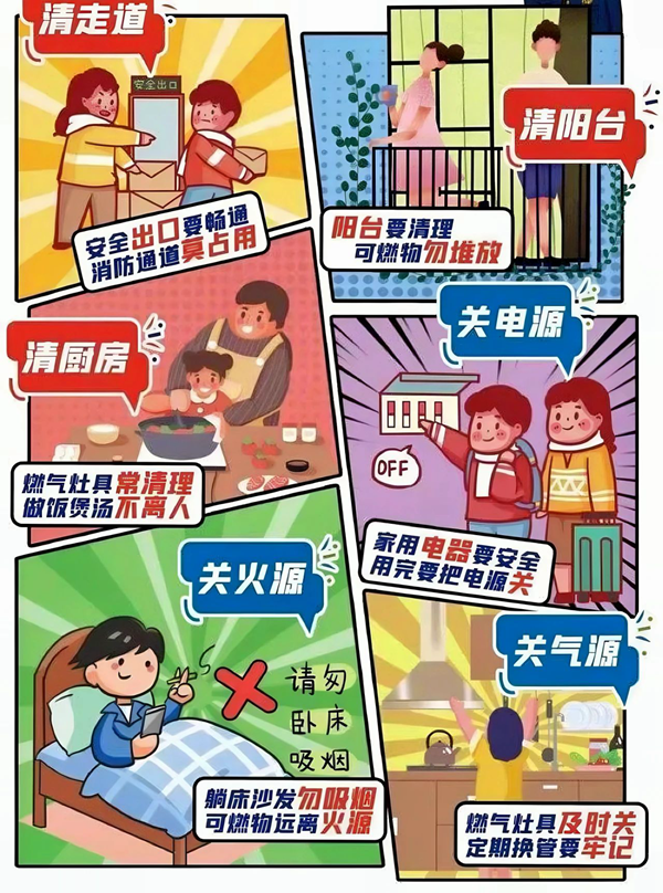 各居民家庭、出租房租户要及时清理阳台、厨房可燃物和楼道杂物,离家和入睡时要关火、关气、关电。教育小孩不要玩火,因农忙外出时不要将小孩独自锁在家里玩耍。严禁将电动自行车、平衡车(电池)在屋内、楼道、门厅停放和充电,严禁违规改装电动自行车。严禁超负荷用电,及时更换老旧电气线路。使用燃气的场所严禁住人。出租屋外窗防盗笼要设逃生口,通往屋顶的出口严禁上锁。