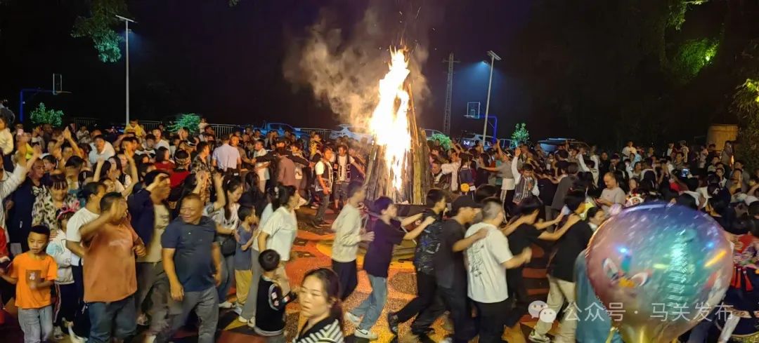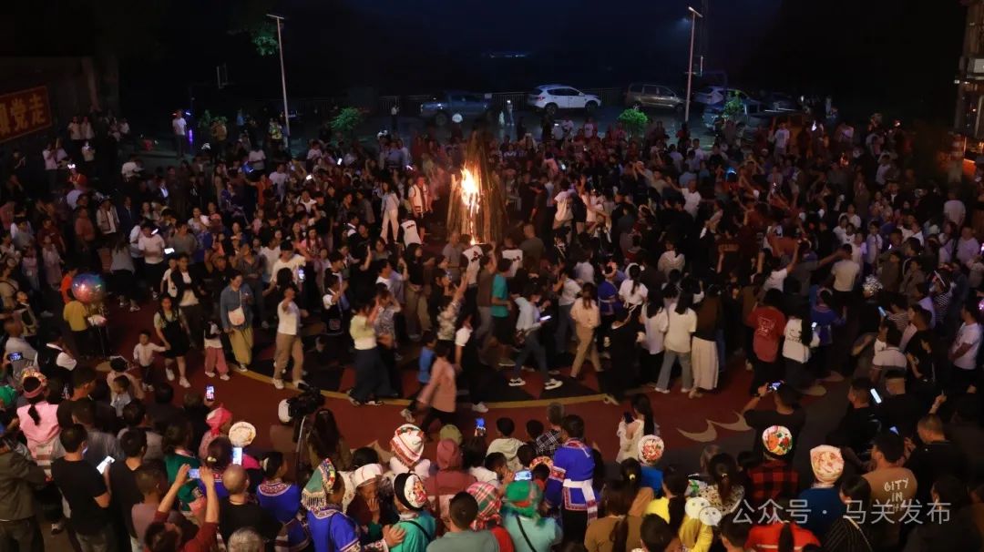 晚饭过后,随着火把的燃起,明亮的篝火瞬间点亮了夜空,烈焰犹如一条火龙在夜空中翻腾飞舞,火光照亮了群众们幸福的脸庞,歌声、笑声、欢呼声交织在一起。