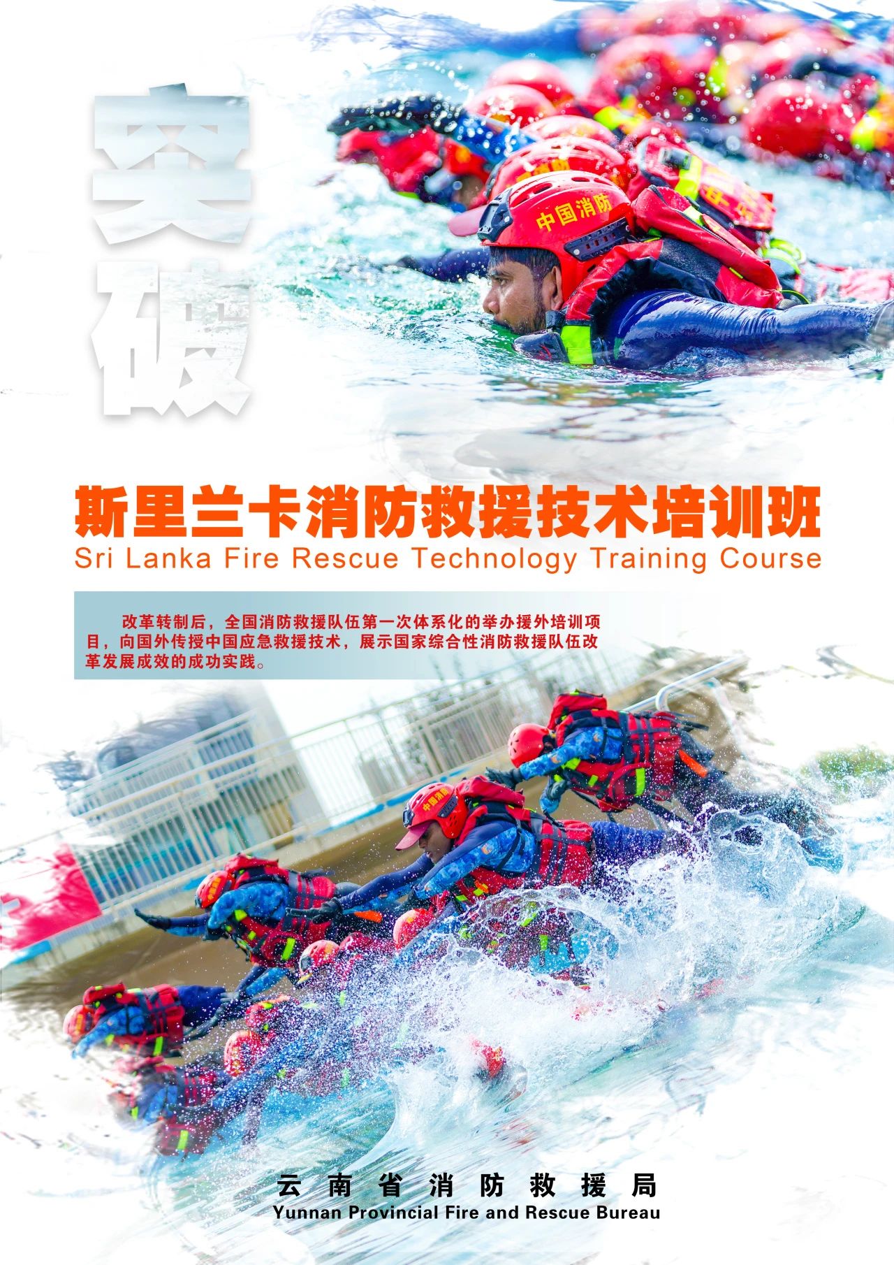 在理论授课中,专门邀请国际知名专家,围绕水域救援技术由来及发展变化、水域救援关键技术、水域救援安全要点等内容,为参训人员进行了系统授课。在实操训练中,教练团队始终将安全放在首要位置,系统讲解了水域救援个人防护装备性能特点、穿戴要求和注意事项,并开展了实操实训。同时,依托急流河道模拟训练设施,结合斯里兰卡水域救援特点真实模拟不同类型水域灾害救援现场,开展了入水法、四种泳姿、安全接近溺者、带人脱困、舟艇组装搬运、舷外机搬运、急流脱困等实用科目训练,重点提升个人技术及团队协同作战能力。在组训施训上,培训班以6人为1组开展培训,每组配备1名安全员、2名教练员和2名翻译人员,采取一对一教学、面对面指导的方式组织,最大限度确保培训取得成效。