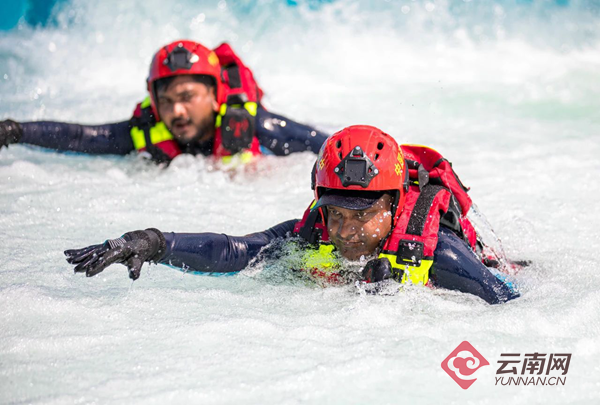 “Be careful.Don´t dive.”在急流脱困训练的现场,经常可以听到教练团队在翻译人员的配合下,向参训学员进行水域救援技术的解释说明。据悉,为了确保参训学员能更好地领悟水域救援技术,教练团队在正式培训前多次与翻译组进行沟通,不断修订课程翻译内容,确保水域救援技术的一些专业术语在翻译为英语后,在不改变其意思的情况下,表述更简洁易懂,确保参训学员能将水域救援的技术方法要领学深悟透。“授课时可能更多的还是要依靠我们教练员的示范,从理论到实践、再从实践到理论的反刍式学习,不仅可以加深参训学员对理论知识的理解,还能为他们以后的救援实践提供有力的帮助和支持。”据来自昭通市消防救援局的水域救援技术教练员李胜龙介绍,在此次培训过程中,培训班以6人为1组开展培训,每组配备1名安全员、2名教练员和2名翻译人员,采取一对一教学、面对面指导的方式组织。同时,整个训练实践过程安排有专人进行训练视频录制,在训练结束后,教练员现场根据视频进行错误动作纠正,确保培训成效立竿见影。