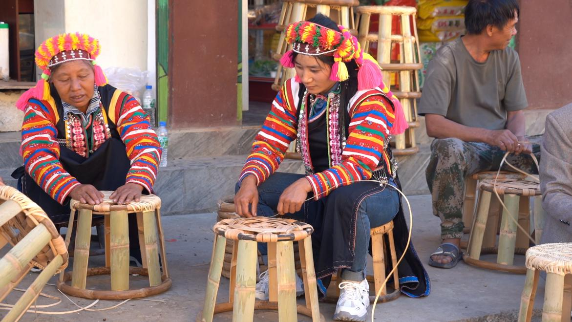 走访二甫新村,就会发现每户人家院落里都堆放着成摞的鼓凳,鼓凳是村里的一大特色产业。每当黄昏降临,哈尼族与拉祜族的妇女们便围坐在一起,一边编织鼓凳,一边闲话家常。