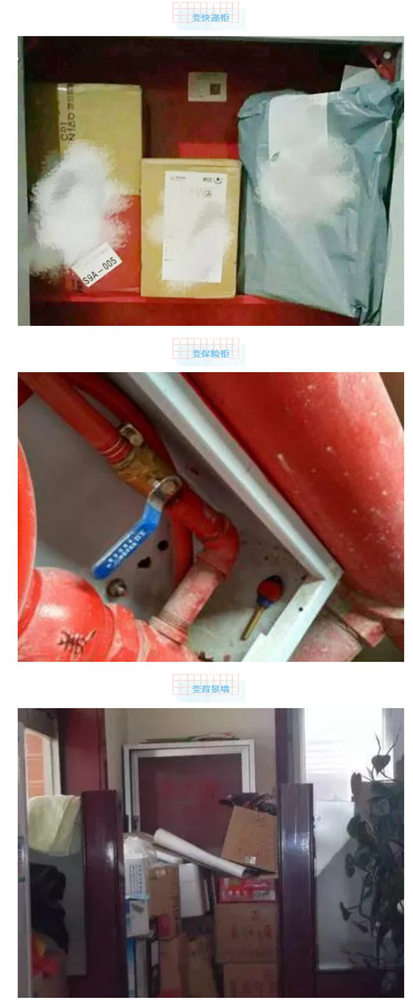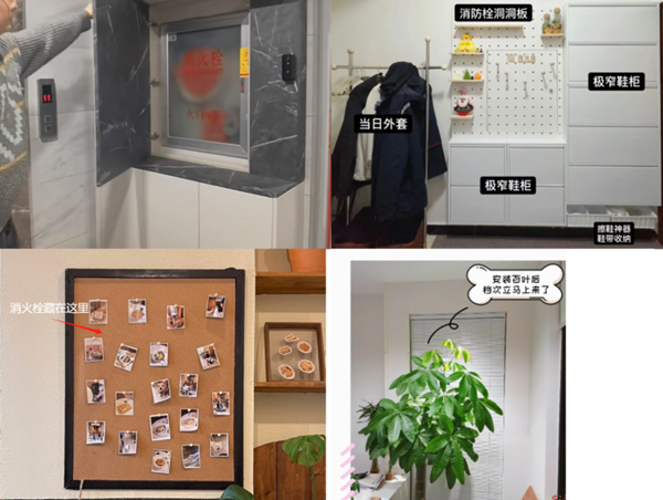 有将室内消火栓改色的,改装成镜子样式的,还有在消火栓箱门板前安装百叶帘、鞋柜或洞洞板的......且这些改装都未设置明显标识。