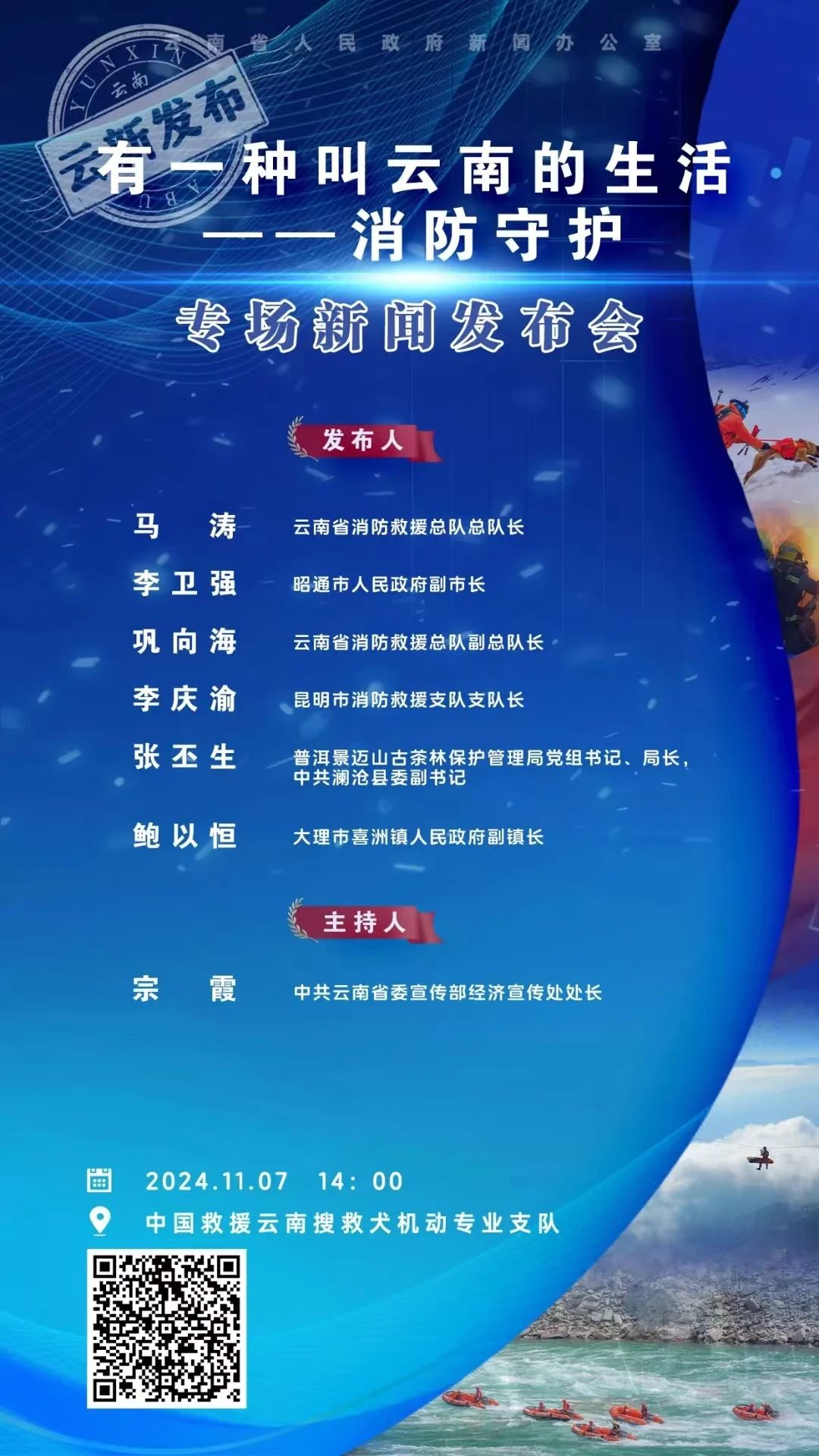 11月7日,召开“有一种叫云南的生活——消防守护”专场新闻发布会。云南省消防救援总队总队长马涛将介绍今年以来全省消防安全形势、有关消防救援工作情况及消防宣传月活动安排。昭通市人民政府、昆明市消防救援支队、普洱景迈山古茶林保护管理局、大理市喜洲镇等相关负责人将介绍各领域消防安全工作开展情况。发布会上,出席会议的有关负责人将现场回答记者提问,为群众答疑解惑。发布会在云南省人民政府门户网站——“网上新闻发布厅”栏目同步直播。