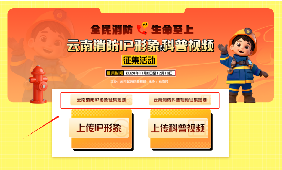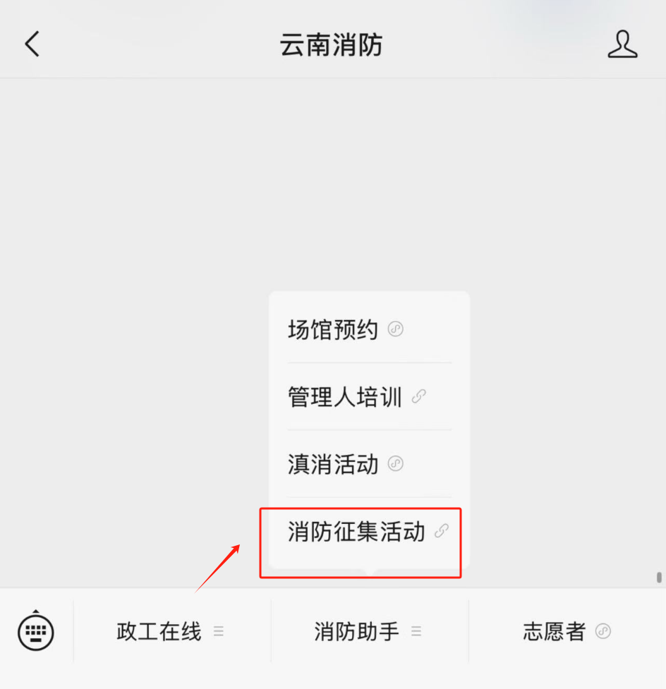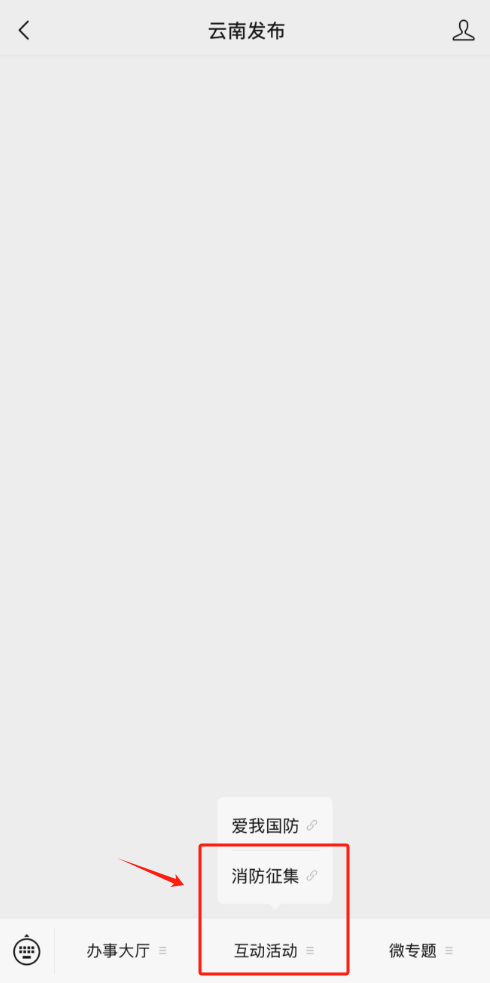 2.在“云南发布”微信公众号首页点击菜单栏“互动活动”“消防征集”,或在“云南消防”微信公众号首页点击菜单栏“消防助手”“消防征集活动”,即可进入活动页面。