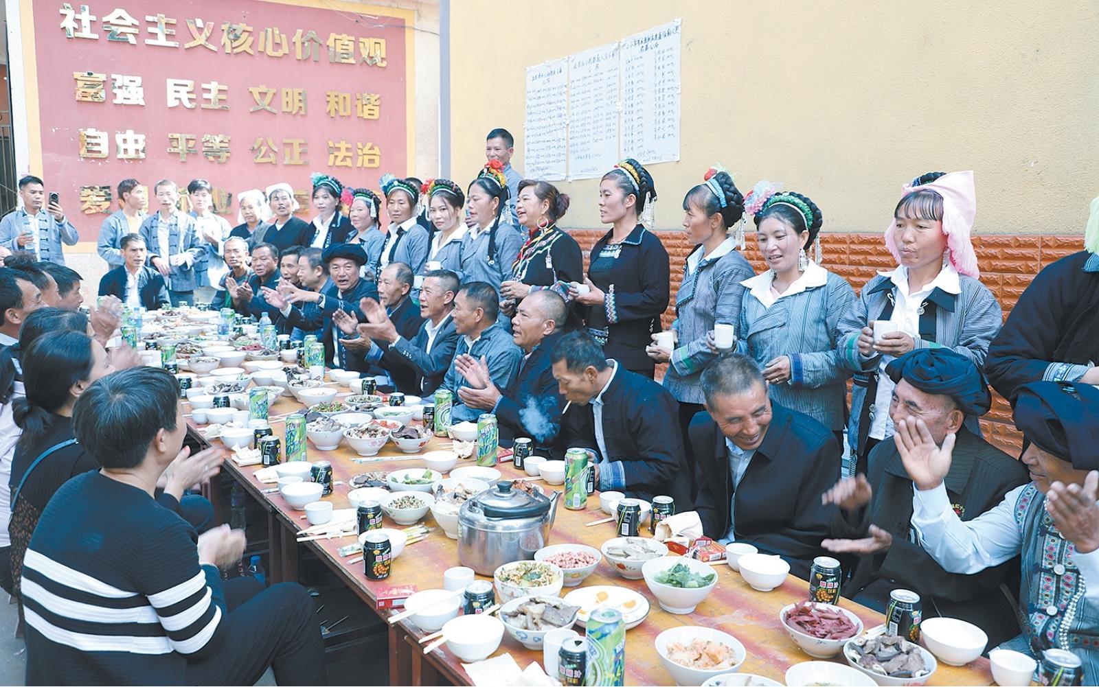 一大早,龙坝镇竜宾村普且村民小组的哈尼族群众就在家里准备美食,从山间野菜到河塘鱼虾,从自家养的土鸡到新鲜蔬菜,家家户户都将烹饪好的美味佳肴摆放到寨子中心的长桌上,八方游客与当地群众围桌而坐,在谈笑声中共吃“百家饭”,共品“团结宴”。哈尼族群众还唱起独具特色的敬酒歌,敲响铓锣大鼓,跳起欢乐的扭鼓舞,在浓浓的节日氛围中传承民族文化,促进各民族和睦相处、团结交融。(通讯员 吴江梅 周钰华 李顺春)