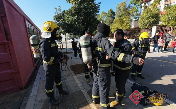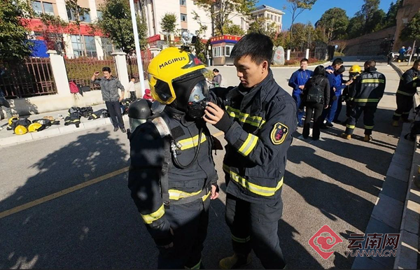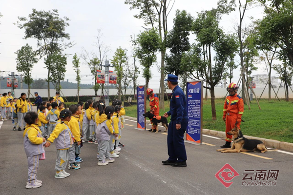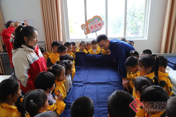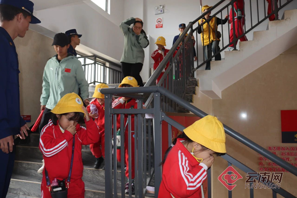 在玉溪市澄江市凤麓消防救援站,消防员引导老师和孩子们开展应急逃生演练。