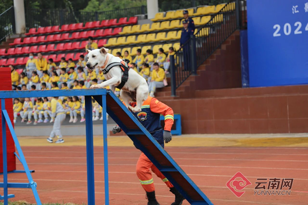 聪明勇敢的搜救犬向大家展示了指挥服从、攀登障碍、箱体搜救、废墟搜救等“独门绝技”,现场掌声不断,尽显“汪”者荣耀。