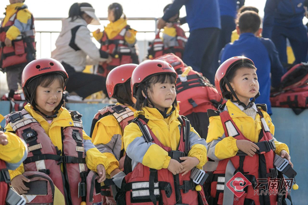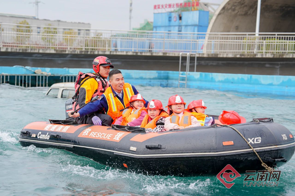 在昭通市国家级水域救援和室内烟火训练基地,孩子们在消防员的保护下,坐上冲锋舟,感受乘风破浪。体验活动期间,大家还爬上斜楼,体验地震后,人在倾斜的房屋中丧失平衡能力而产生的眩晕感。