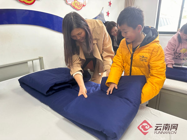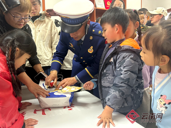 在曲靖市紫云路特勤站“永山班”,孩子们参加了穿戴灭火战斗服、抢险救援服、叠“豆腐块”、安全隐患排查、消防安全知识问答四个环节的挑战活动,在挑战中获取印章和小礼品。