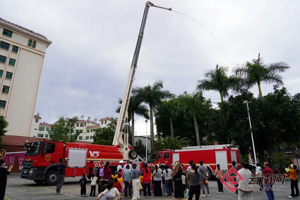 在德宏州“最美国门消防站”姐告消防救援大队,消防员向大家讲解高喷车的用途,并现场演示高喷车出水。