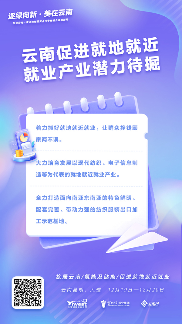 投资云南·促进就地就近就业专题推介会在昆明举办,邀请了深圳中科天域低空数字科技有限公司、宏大建设集团有限公司、云泽投资管理(上海)有限公司、仁和集团(香港)有限公司、浙江观品科技发展有限公司等近30家行业龙头和重点企业代表参加。会上,北京市长城企业战略研究所发布了云南促进就地就近就业产业投资机会清单、敏感要素清单;云南省就业局领导作惠企政策宣讲;昆明市、昭通市、保山市投资促进部门,云南人力资源开发有限责任公司分别开展了重点项目和人力资源推介;各方围绕用工政策和项目要素保障条件进行了深入交流,初步形成一批投资意向。