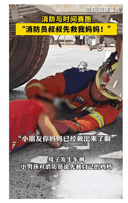 2024年5月25日,昆明一对母子骑电动车时,不慎被转弯的混凝土车卷入车底,看到消防员到场后,小朋友请求消防员,先救自己的妈妈。救援过程中,消防员趴在孩子身旁,不断给他加油打气,最终母子俩都被顺利救出。