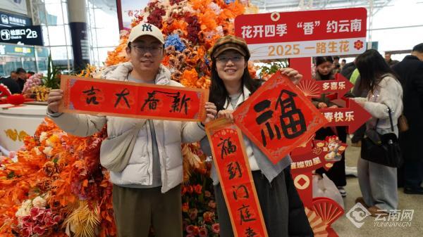 春运期间的火车站人潮涌动,活动现场更是热闹非凡。旅客们纷纷驻足观看,有序排队挑选自己喜爱的春联,拿在手中细细品味。还有不少旅客拿出手机拍照留念,将这份浓浓的“年味”分享给远方的亲朋好友。来自天津的殷女士和王先生恰好路过此地,他们表示能在这场活动中感受到昆明的新年氛围感到非常幸运,特意向书法家求取了一副对联,准备将这份独特的祝福带回家。