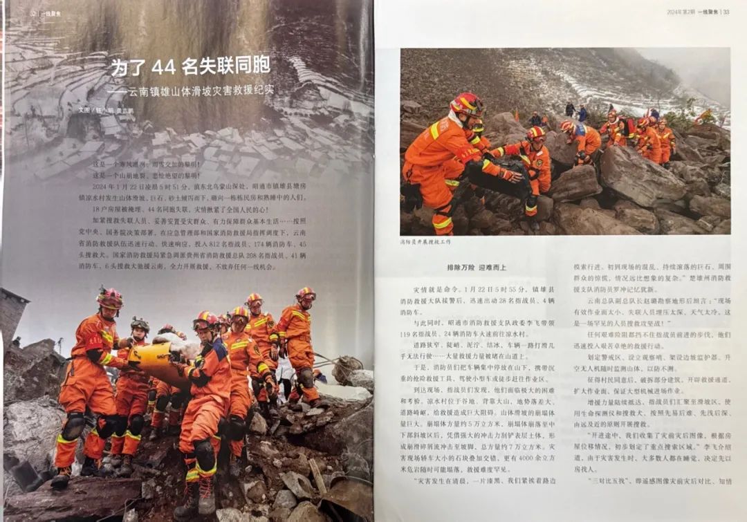 获奖作品《为了44名失联同胞——云南镇雄山体滑坡灾害救援纪实》由钮小明、黄志鹏撰写。2024年1月22日,昭通市镇雄县塘房镇凉水村发生山体滑坡地质灾害,造成44名同胞被埋压。灾情发生后,云南消防救援队伍第一时间赶赴现场救援,克服地形复杂、塌方量大、人员埋压深和低温雨雪冰冻等困难,夜以继日,连续奋战,成功搜救出全部遇难群众,用勇气、毅力和专业,书写了对生命的尊重和守护。两位作者第一时间采写长篇通讯,通过生动的救援场景、感人的救援故事,让读者身临其境感受到了灾难的残酷、生命的珍贵,也让读者对消防救援工作有了更深入、全面的了解,有效展现了云南消防队伍的勇敢无畏和忠诚担当。