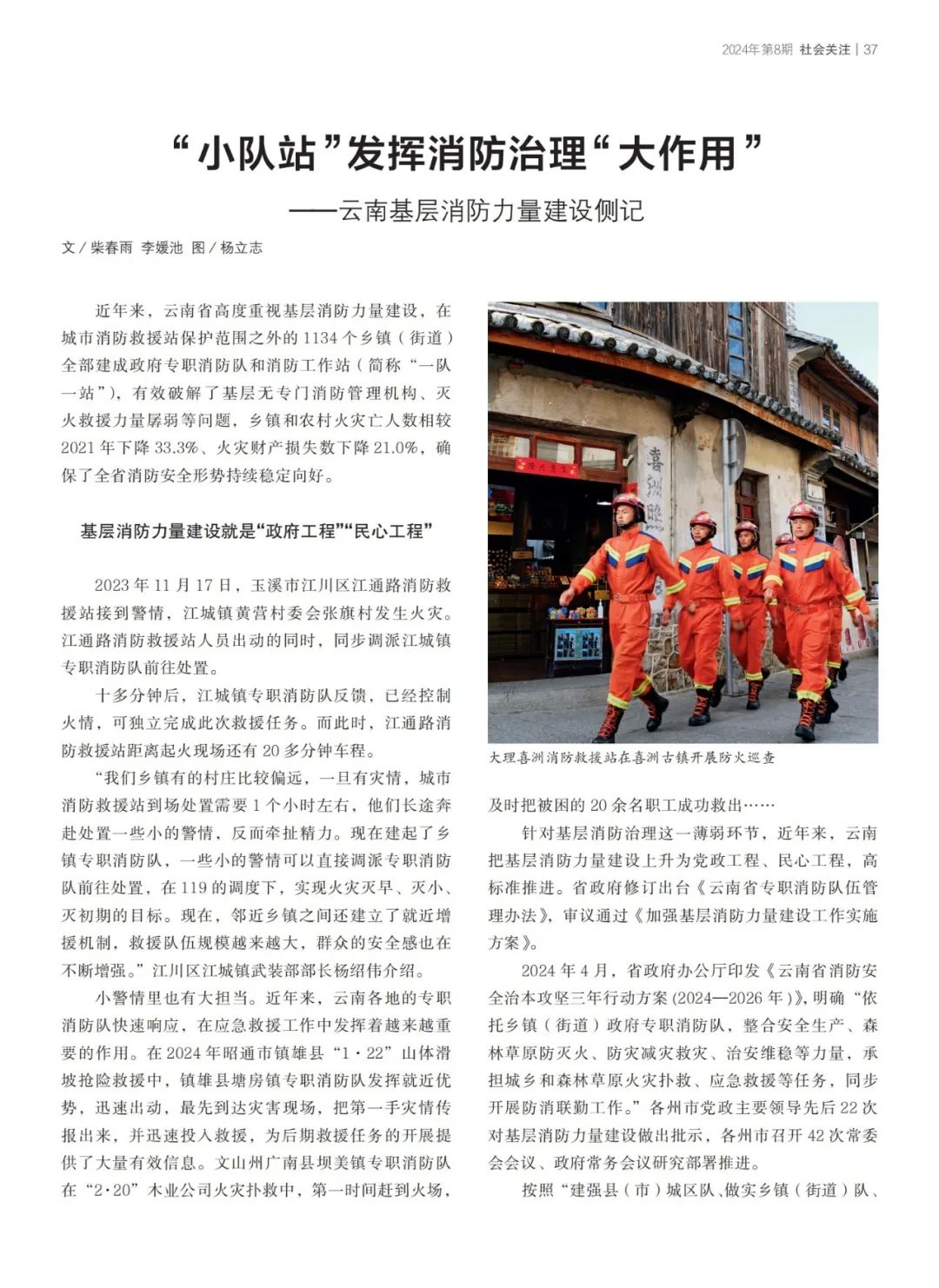 获奖作品《“小队站”发挥消防治理“大作用”——云南基层消防力量建设侧记》由柴春雨、李嫒池撰写。近年来,云南省消防救援总队紧盯基层末梢消防力量薄弱、“小火亡人”突出的现实难题,主动作为、改革创新,强力推动在城市消防站保护范围外的1134个乡镇(街道)建设“一队一站”,推动实现“一支队伍搞救援”,从整体上提升了基层消防治理能力和防灾减灾救灾水平。作品聚焦群众关切,通过大量认真、细致的调查和采访,用独特的视角、鲜活的场景,生动呈现了云南基层消防力量建设工作的重要突破和显著成绩,折射出了云南消防队伍的创新、务实和担当。