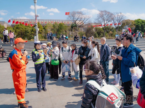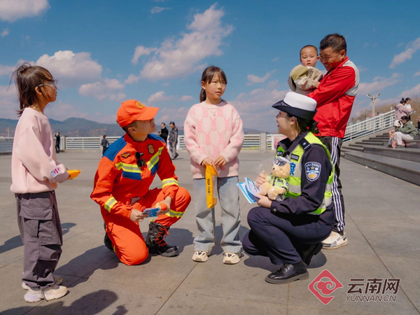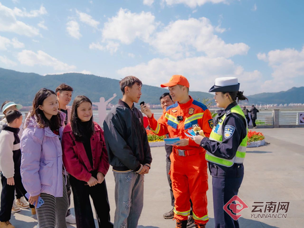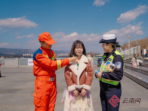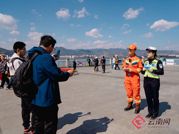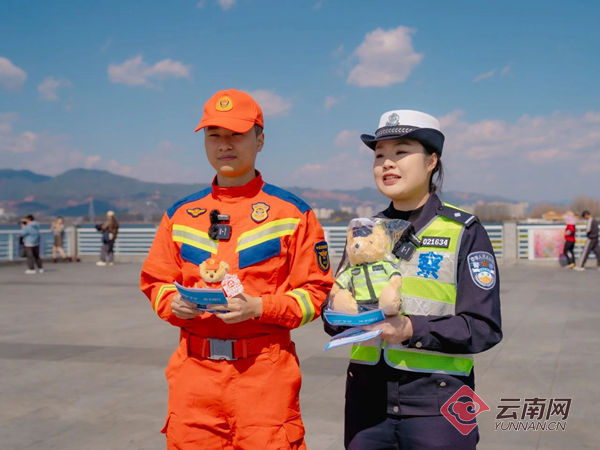 直播过程中,“消警”宣传小分队来到滇池海埂大坝,开展“守护平安 携手同行”“电动自行车消防安全科普”“一盔一带”主题宣讲活动。给现场群众带来了精心编排的趣味街采,干货满满的安全知识,还为大家送上文创小熊及精美礼物。