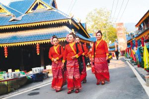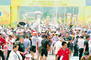 市民、游客在磨憨站站前广场参加泼水节活动。记者杜文蕾摄