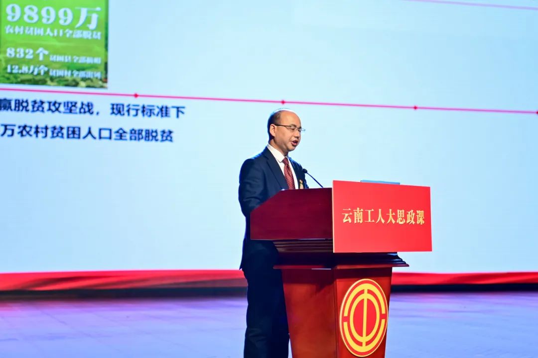 “习近平总书记再次亲临云南考察指导,发表重要讲话、作出重要指示,为云南现代化建设指明了前进方向,也为我们深化新时代思想政治教育指明了方向。”省总工会党组书记、常务副主席王宏说,“今天在云南大学启动‘云南工人大思政课’首场宣讲活动,正是贯彻落实党的二十届三中全会精神和习近平总书记考察云南重要讲话精神的具体举措,也是落实中华全国总工会职工群众思想政治引领建设工程和创新打造‘中国工人大思政课’要求的具体体现,我们要学习好、宣传好、贯彻好习近平总书记考察云南重要讲话精神,让劳模精神、劳动精神、工匠精神在百年学府绽放时代光彩。”