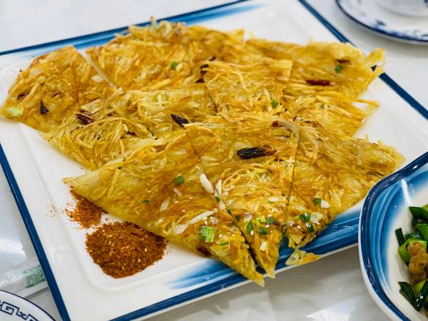 锅铲上下翻飞,将切作均匀细丝的洋芋织成一张酥脆的金网,边缘酥脆,中心香软,再撒上火腿末、香葱、芝麻等调料,为洋芋“薄饼”增加了云南特色风味,咬上一口,三分酥脆裹着七分软糯,是最寻常也最好味的家常菜。