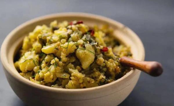 这道类似于土豆泥的菜品名为“老奶洋芋”,做法很是讲究,将煮透的洋芋碾作泥状,加入辣椒、酸腌菜、茴香、小葱等不同的调料爆炒,各色调料、配菜的味道丝毫不喧宾夺主,而是巧妙融入洋芋本身的醇香中,鲜香四溢,入口细腻柔软,是云南人离不开的家常至味。