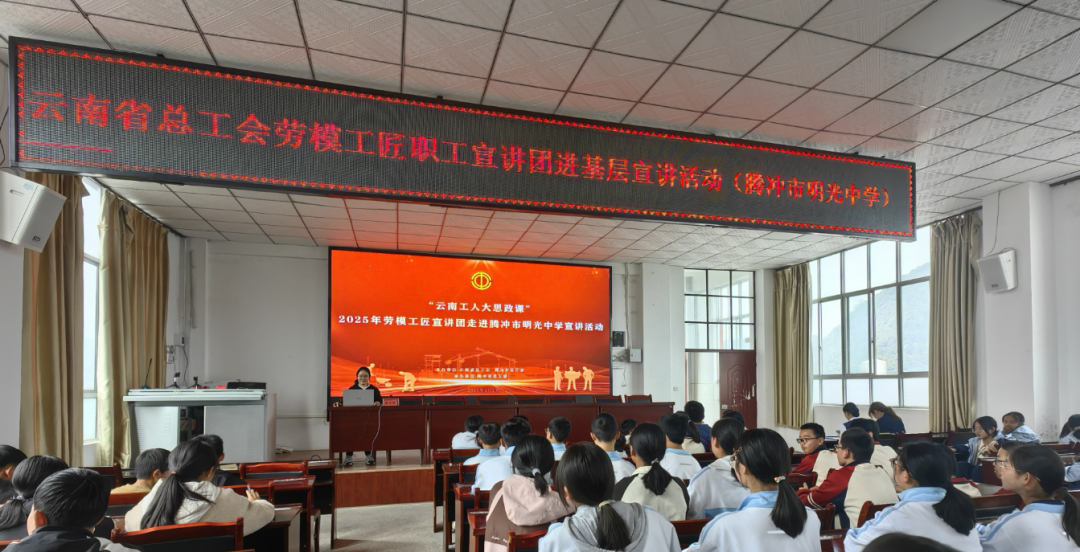 在明光中学,中共腾冲市委党校胡小松老师以《铸牢中华民族共同体意识》为专题,通过启发思维、理清思路、鼓舞干劲等宣讲方式,巧妙地将劳模精神与民族团结有机融合,通过例举“腾冲抗战史”“左孝臣戍边”等感人故事,鼓励同学们以劳模工匠为榜样,以民族团结为纽带,将“爱岗敬业、争创一流、艰苦奋斗、勇于创新”的精神融入学习生活,让劳模精神与民族团结之花在明光大地上越开越绚烂。