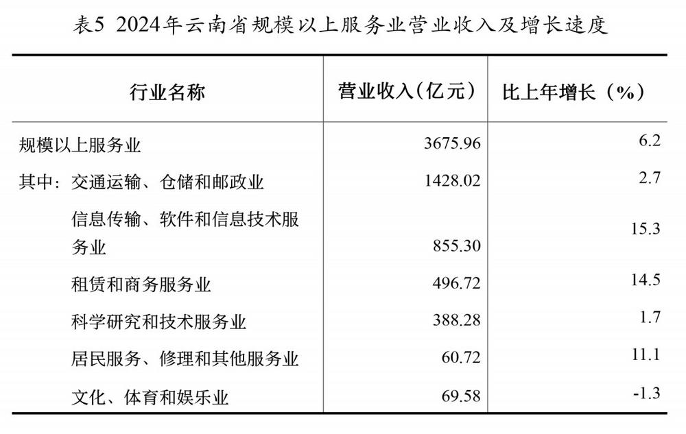 表5 2024年云南省规模以上服务业营业收入及增长速度