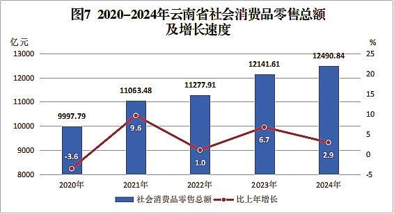 图7 2020—2024年云南省社会消费品零售总额及增长速度