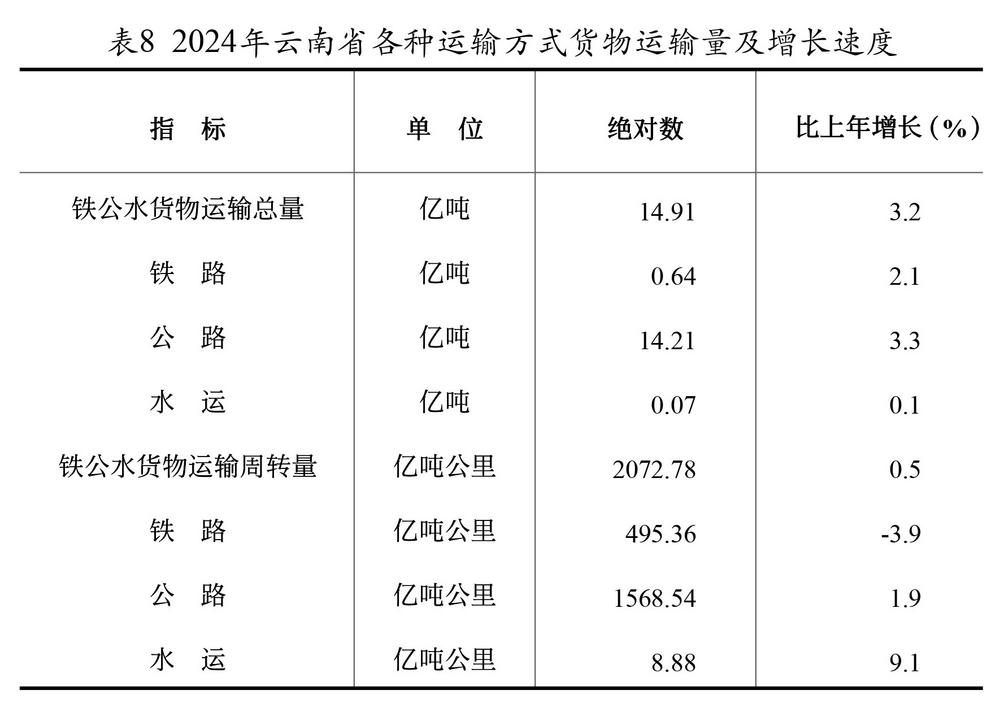 表8 2024年云南省各种运输方式货物运输量及增长速度
