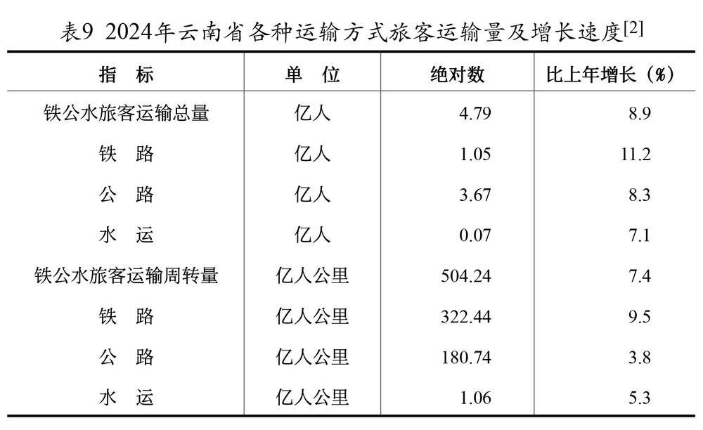 表9 2024年云南省各种运输方式旅客运输量及增长速度[10]